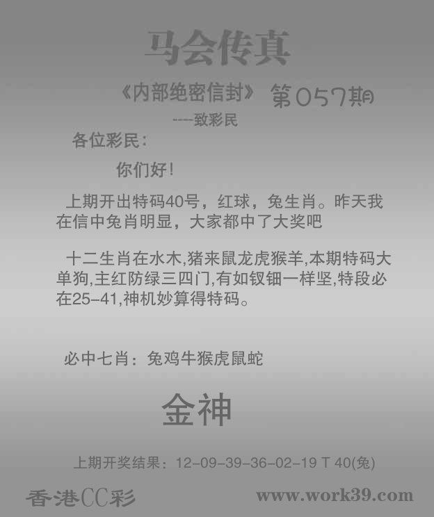 | 057期: ⑥肖 | 鸡猴兔猪虎蛇 | 马13中 |